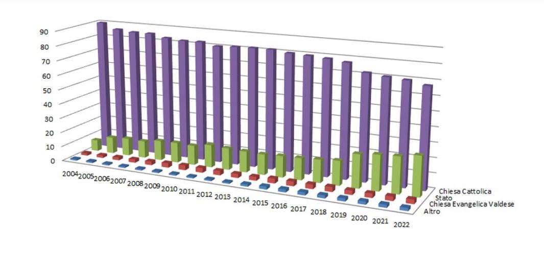Al secondo posto nella distribuzione dell’8 per mille nel 2024 c’è lo Stato, che ha ricevuto una quota significativa dei fondi, a quota 340 milioni. Al terzo la Chiesa Valdese, a quota 40,3 milioni, che utilizza i fondi esclusivamente per progetti sociali, assistenziali, umanitari e culturali, senza impiegarli per il culto. Oltre che delle scelte espresse dai contribuenti, la Chiesa beneficia anche delle quote non esplicitamente destinate, che vengono ripartite in proporzione alle preferenze espresse.