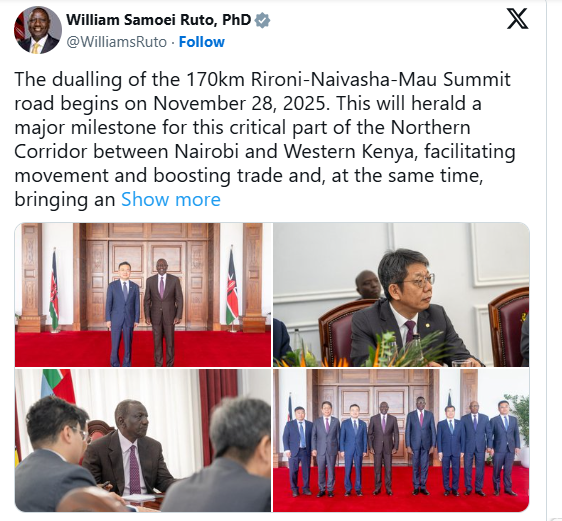 Sulla traiettoria nord, Ruto ha annunciato che il raddoppio della strada Rironi-Naivasha-Mau, lunga 170 km, inizierà il 28 novembre 2025.