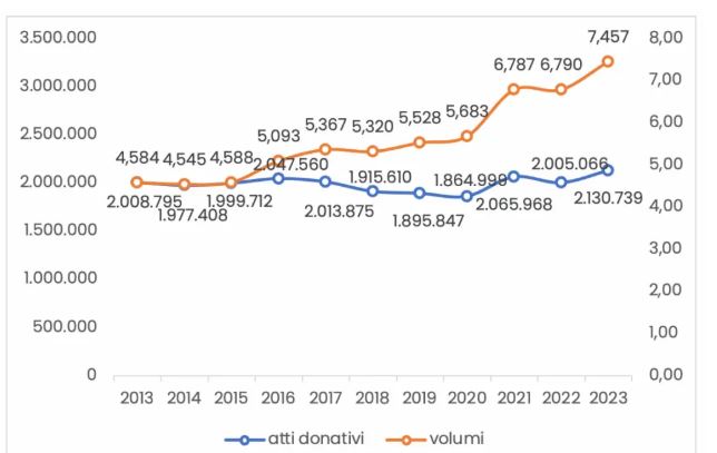 Ebbene, emerge che cresce sia il volume complessivo di donazione (+9,83%) che quello degli atti donativi (+6,7%).