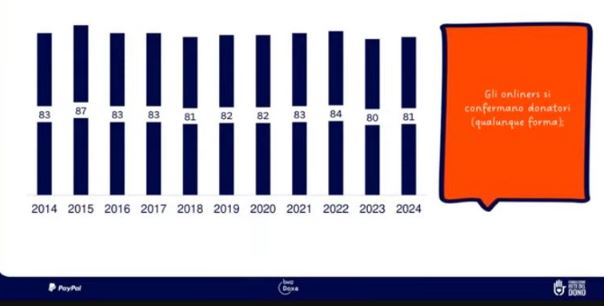 Anche l’indagine Donare 3.0 di BVA Doxa del 2024 – considerata nella sintesi di Atlantis – aveva evidenziato un calo dei donatori digitali: 80% nel 2023 vs 84% del 2022, con il valore più basso registrato in 10 anni di indagine.
