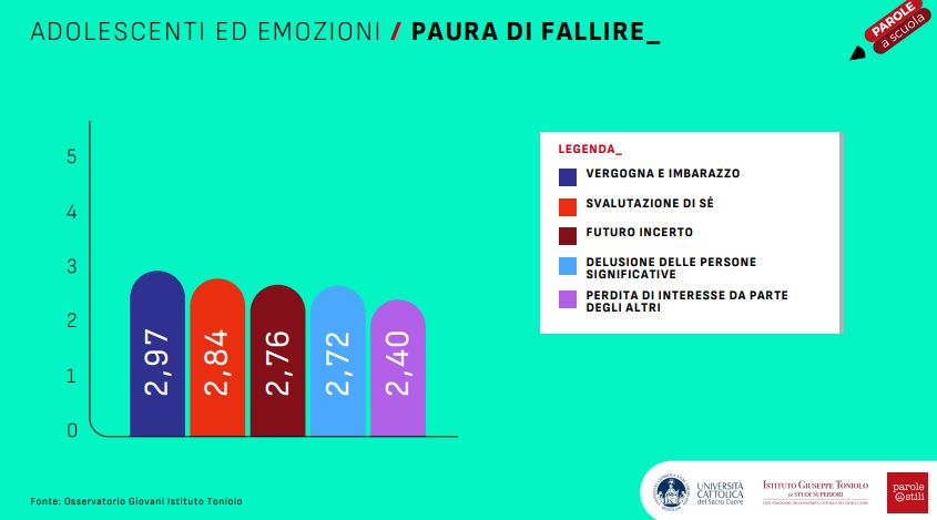 Il timore del fallimento è diffuso e pervasivo tra gli adolescenti, con il valore più alto legato alla paura di provare vergogna e imbarazzo dopo un errore, seguita dalla svalutazione di sé e dal timore di deludere le persone significative. Minore, ma comunque presente, il timore di diventare impopolari.