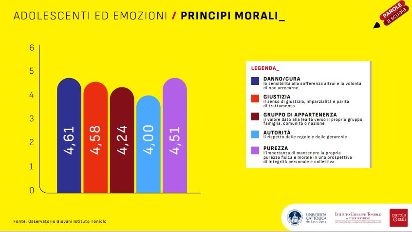 La generazione Z dimostra buoni livelli di empatia e una forte attenzione ai principi morali. I valori più sentiti sono: “prendersi cura/non arrecare danno” (4,61 su 6), “giustizia (4,58 su 6)”, “purezza e integrità personale”, (4,51 su 6).