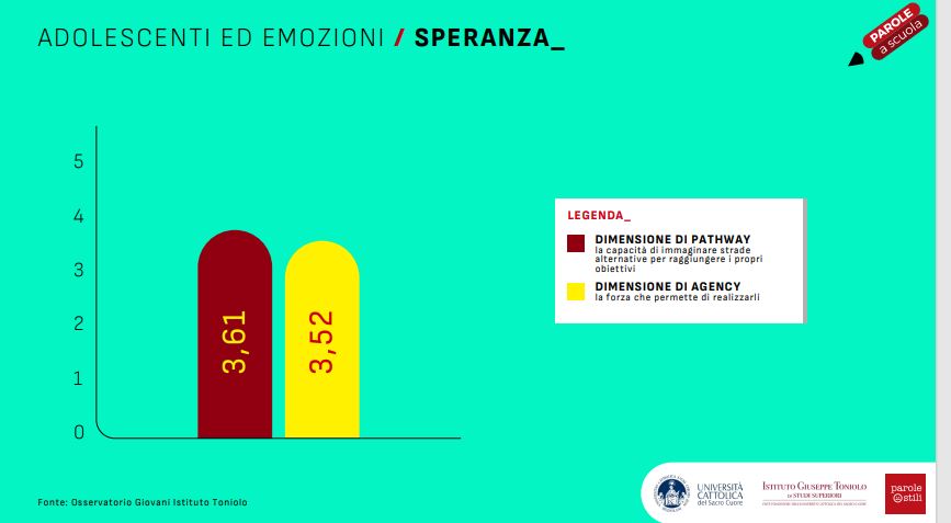 La ricerca, condotta su un campione rappresentativo di 815 adeloscenti italiani tra i 14 e i 19 anni, attraverso la metodologia CAWI (Computer Assisted Web Interview), sostiene che nonostante un clima sociale spesso scoraggiante, gli adolescenti italiani mantengono un buon livello di speranza attiva e motivazione interna per raggiungere i propri obiettivi.