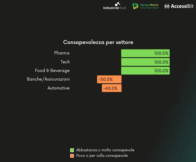 Ebbene, nell’indagine viene definito bene proprio questo concetto e perimetro. Significa adottare pratiche consapevoli che riducano l’impronta ambientale, promuovano l’accessibilità e garantiscano un utilizzo etico e responsabile delle tecnologie e del digitale. Primo punto indagato, la consapevolezza, l’informazione delle persone coinvolte nei processi aziendali.