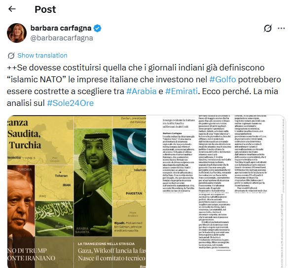 I Paesi islamici, racconta un articolo di Barbara Carfagna sul Sole, parlano di questo assetto come di una sorta di Islamic Nato. Con la Turchia – formalmente Paese della Nato vera – a giocare con un piede in due scarpe, e l’India costretta a guardare con qualche preoccupazione ai nuovi equilibri del quadrante, che mettono pure in discussione il Corridoio IMEC (India, Medio Oriente, Europa).