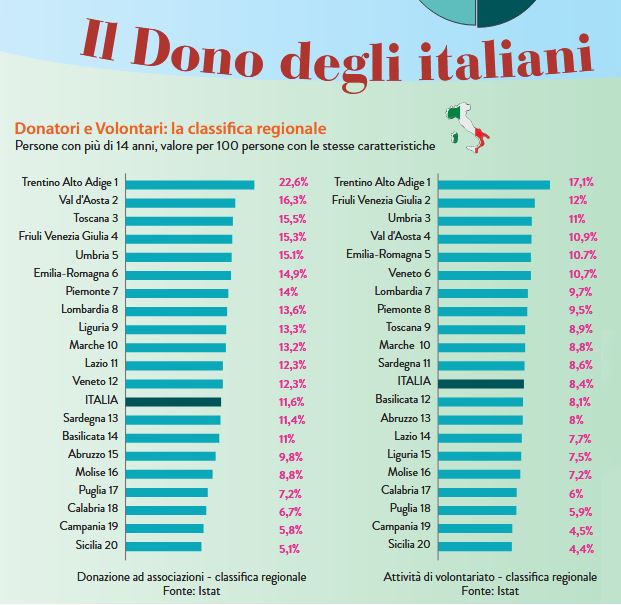 Le donazioni in Italia? I più generosi – in chiave regionale – sono nel Trentino Alto Adige, al primo posto sia per numero di donatori che per numero di volontari. Al secondo posto per donatori c’è la Valle d’Aosta, al terzo la Toscana, ma con Friuli, Umbria ed Emilia molto vicini. Sopra la media nazionale anche Piemonte, Lombardia, Liguria, Marche, Lazio e veneto, nell’ordine.