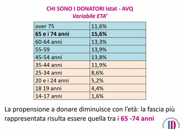 Chi sono i generosi? I donatori di risorse economiche si collocano, come è del resto nelle attese, soprattutto sopra i 44 anni, con la percentuale più alta (15,6%) tra i 65-74. A donare di più sono tendenzialmente le donne (fino ai 60 anni) e, certamente, laureati, persone del nord, con il livello più basso nelle Isole.
