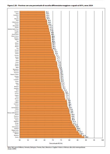 Tra le grandi città, Bologna è la più virtuosa con il 72,8%, seguita da Padova, Venezia e Milano (oltre il 60%). Roma è ferma al 48%, Napoli al 44,4%, mentre Messina e Bari sono sotto il 50%. Il divario urbano è un problema serio: le metropoli hanno più complessità logistiche e costi elevati.