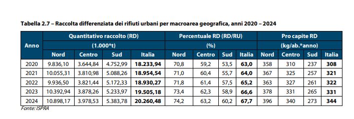 Il divario territoriale resta evidente. Il Nord Italia è il motore della raccolta differenziata, con una media del 74,2%, grazie a impianti moderni e sistemi di raccolta capillari. Il Centro si ferma al 63,2%, mentre il Sud è al 60,2%, pur mostrando segnali di miglioramento. Alcune regioni meridionali, come la Sicilia, sono ancora sotto il 55%, penalizzate da carenze impiantistiche e organizzative.