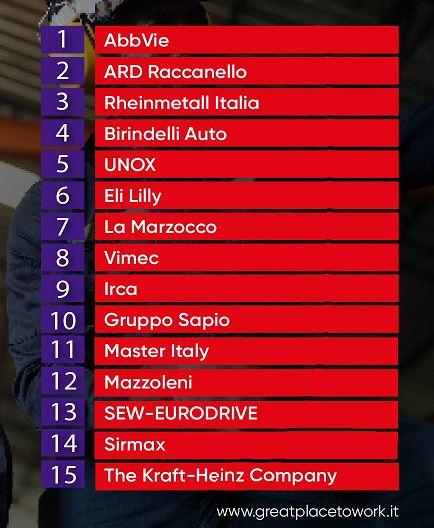 Ma quale è il podio della top 15 secondo lo studio? Sul gradino più alto troviamo AbbVie, azienda biofarmaceutica globale che ha il proprio sito produttivo a Campoverde di Aprilia (LT) e la sede centrale italiana a Roma. Al secondo posto c’è ARD Raccanello, azienda leader nella produzione e commercializzazione di prodotti vernicianti per l’edilizia con sede a Padova mentre completa il podio, sul gradino più basso, Rheinmetall Italia spa, realtà leader mondiale nella difesa e sicurezza che opera in oltre 60 paesi come parte di uno dei principali gruppi industriali europei