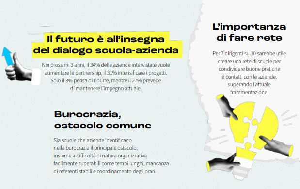 Uno degli aspetti più interessanti del rapporto è l’analisi degli obiettivi educativi condivisi tra scuola e impresa. Le scuole vedono nella collaborazione con le aziende un’opportunità per rafforzare l’offerta formativa, aggiornare i contenuti didattici e offrire agli studenti strumenti concreti per affrontare il futuro. Le aziende, dal canto loro, riconoscono il valore strategico di investire nella formazione delle nuove generazioni, contribuendo allo sviluppo del capitale umano e del territorio.